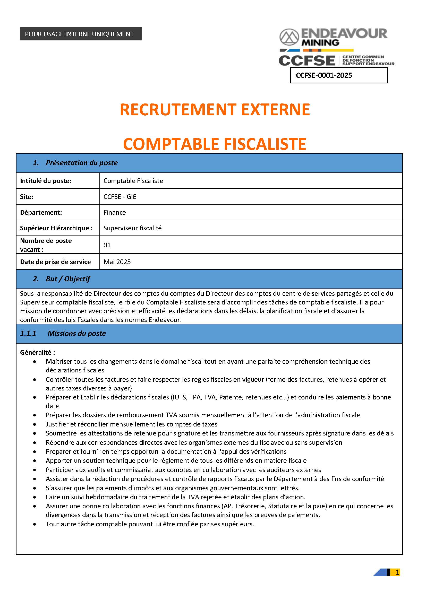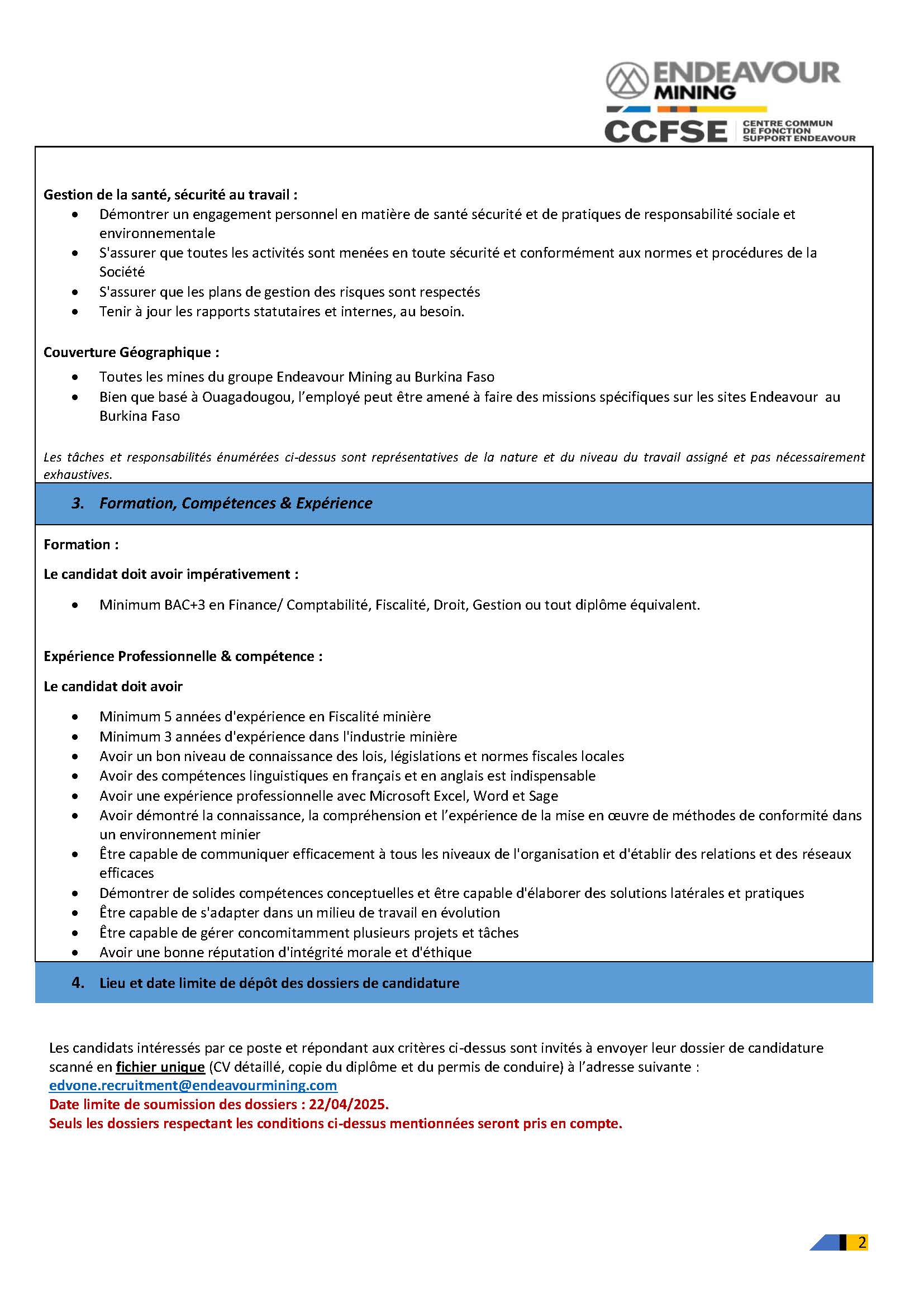 - HOUNDE GOLD OPERATION, filiale du Groupe ENDEAVOUR SA souhaite recevoir des candidatures pour le recrutement d’UN (01) INGENIEUR SENIOR DYNAMITAGE (H/F)