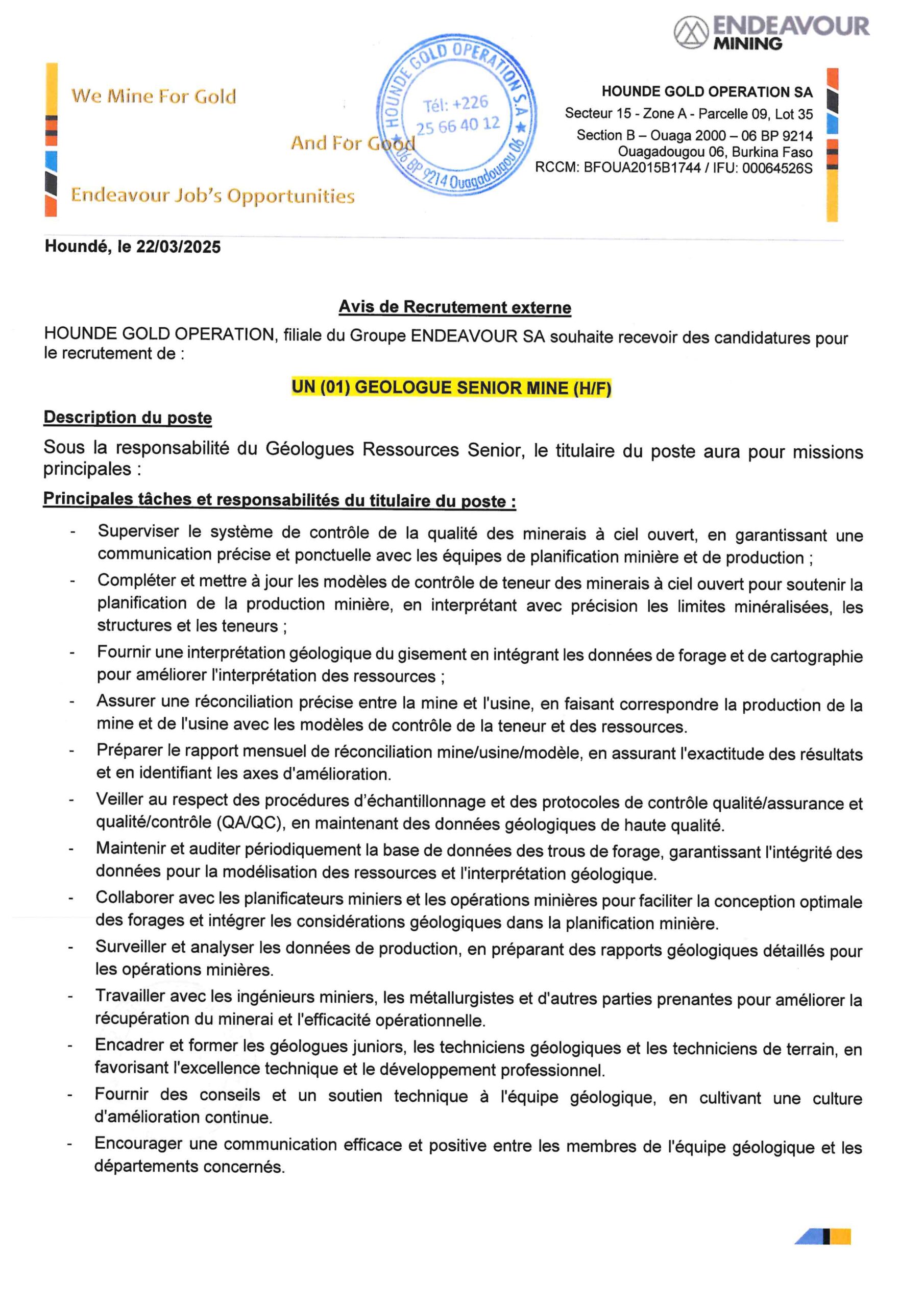 • HOUNDE GOLD OPERATION, filiale du Groupe ENDEAVOUR SA souhaite recevoir des candidatures pour le recrutement d’UN (01) GEOLOGUE RESSOURCES SENIOR (H/F)