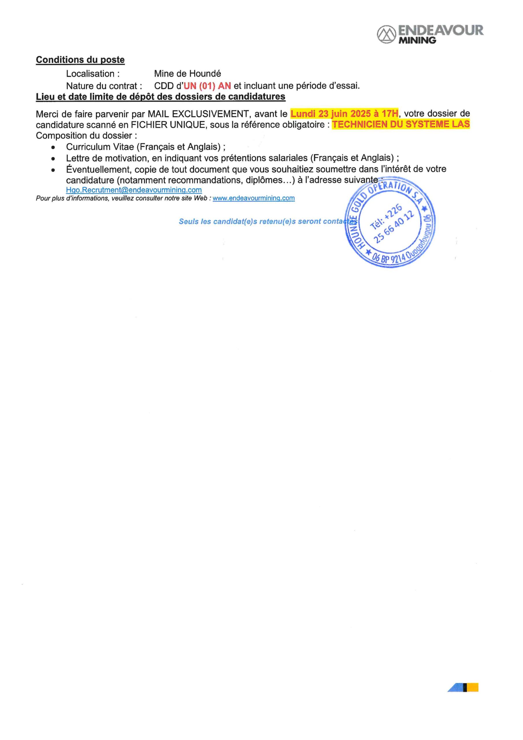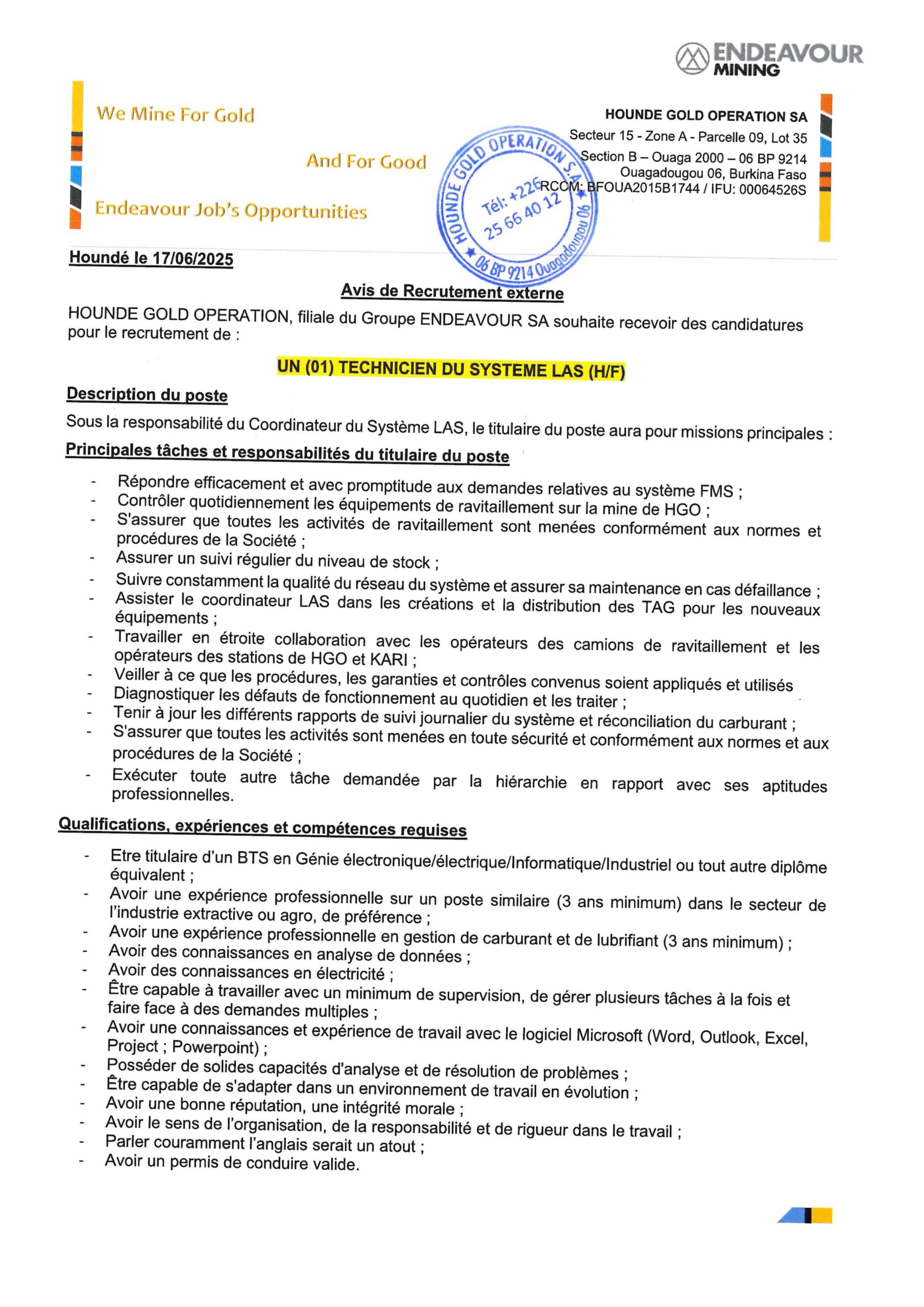 HOUNDE GOLD OPERATION, filiale du Groupe ENDEAVOUR SA souhaite recevoir des candidatures pour le recrutement de : (01) TECHNICIEN DU SYSTEME LAS (H/F)