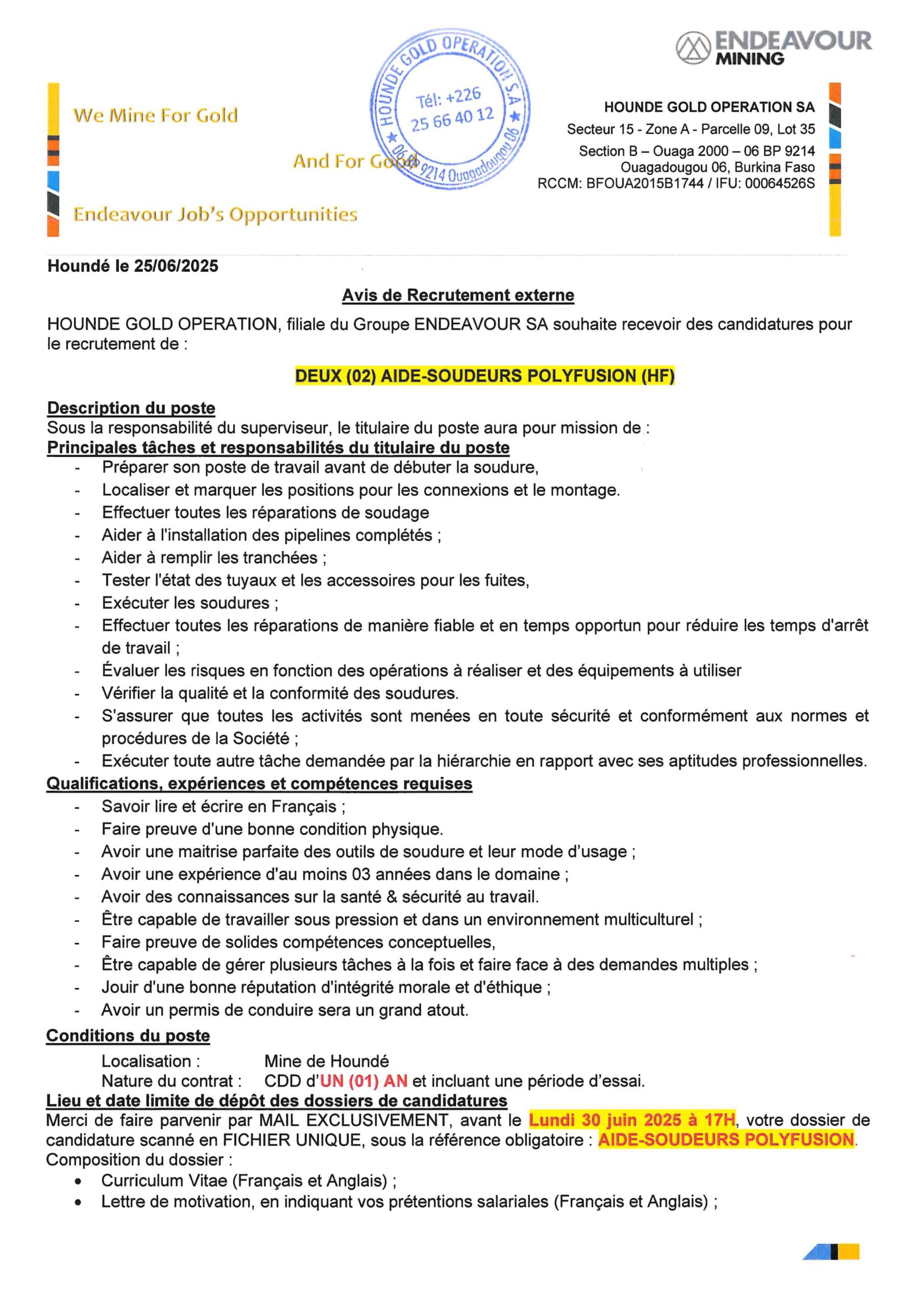 HOUNDE GOLD OPERATION, filiale du Groupe ENDEAVOUR SA souhaite recevoir des candidatures pour le recrutement de DEUX (02) AIDE-SOUDEURS POLYFUSION (HF)