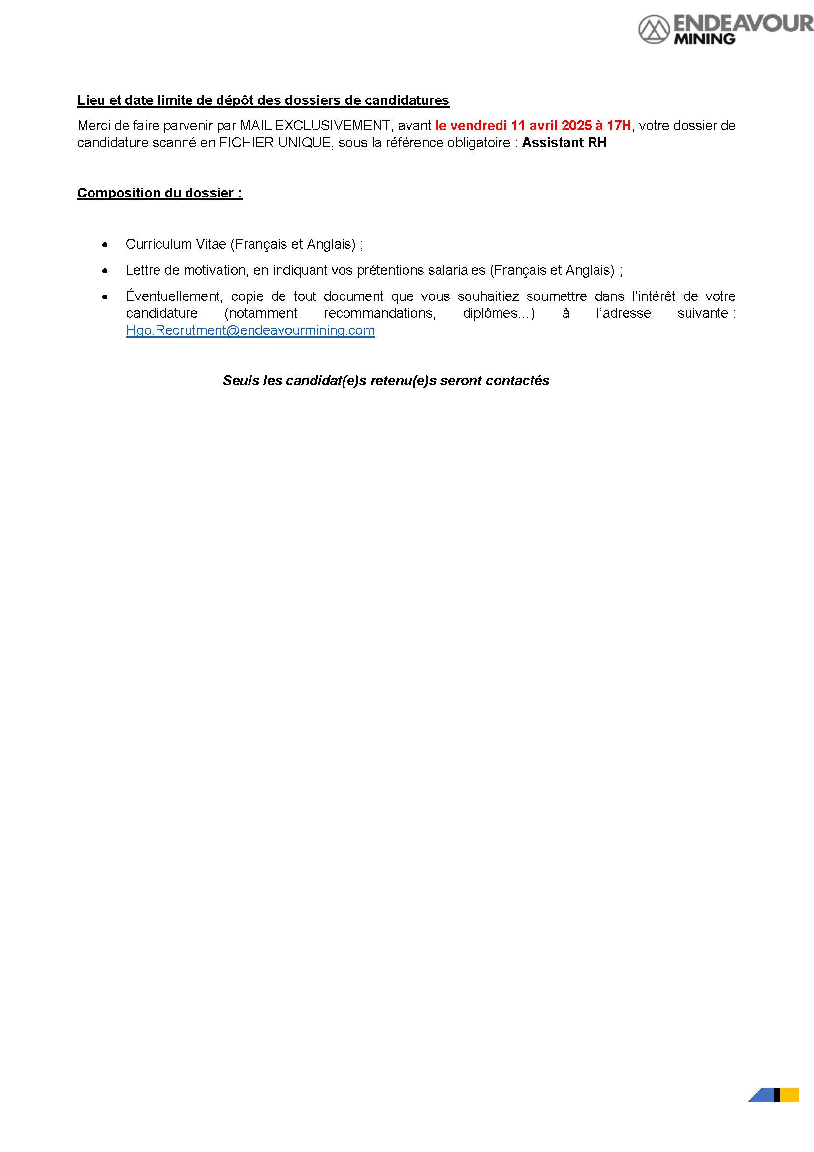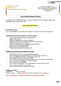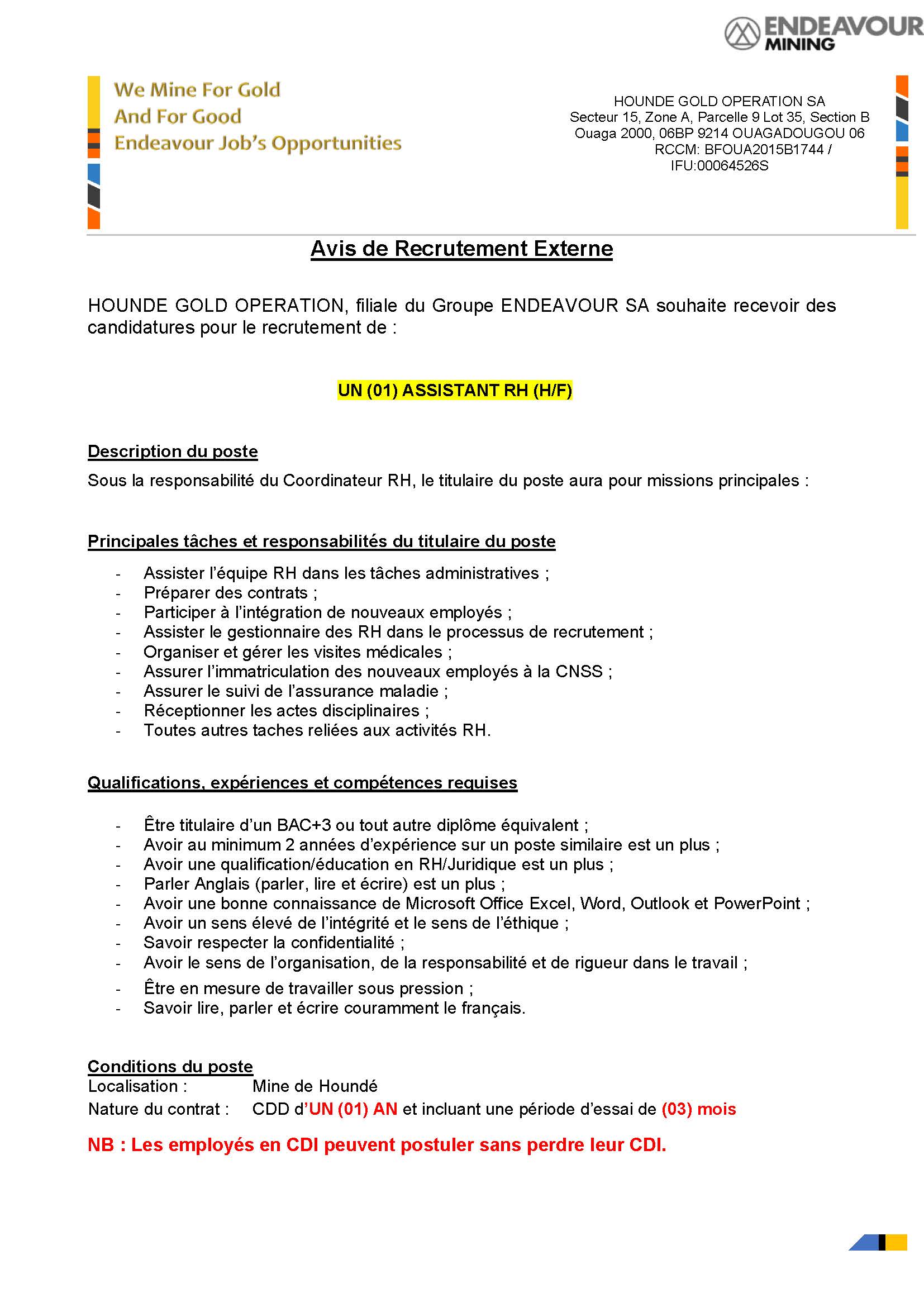 HOUNDE GOLD OPERATION, filiale du Groupe ENDEAVOUR SA souhaite recevoir des candidatures pour le recrutement de : UN (01) ASSISTANT RH (H/F)