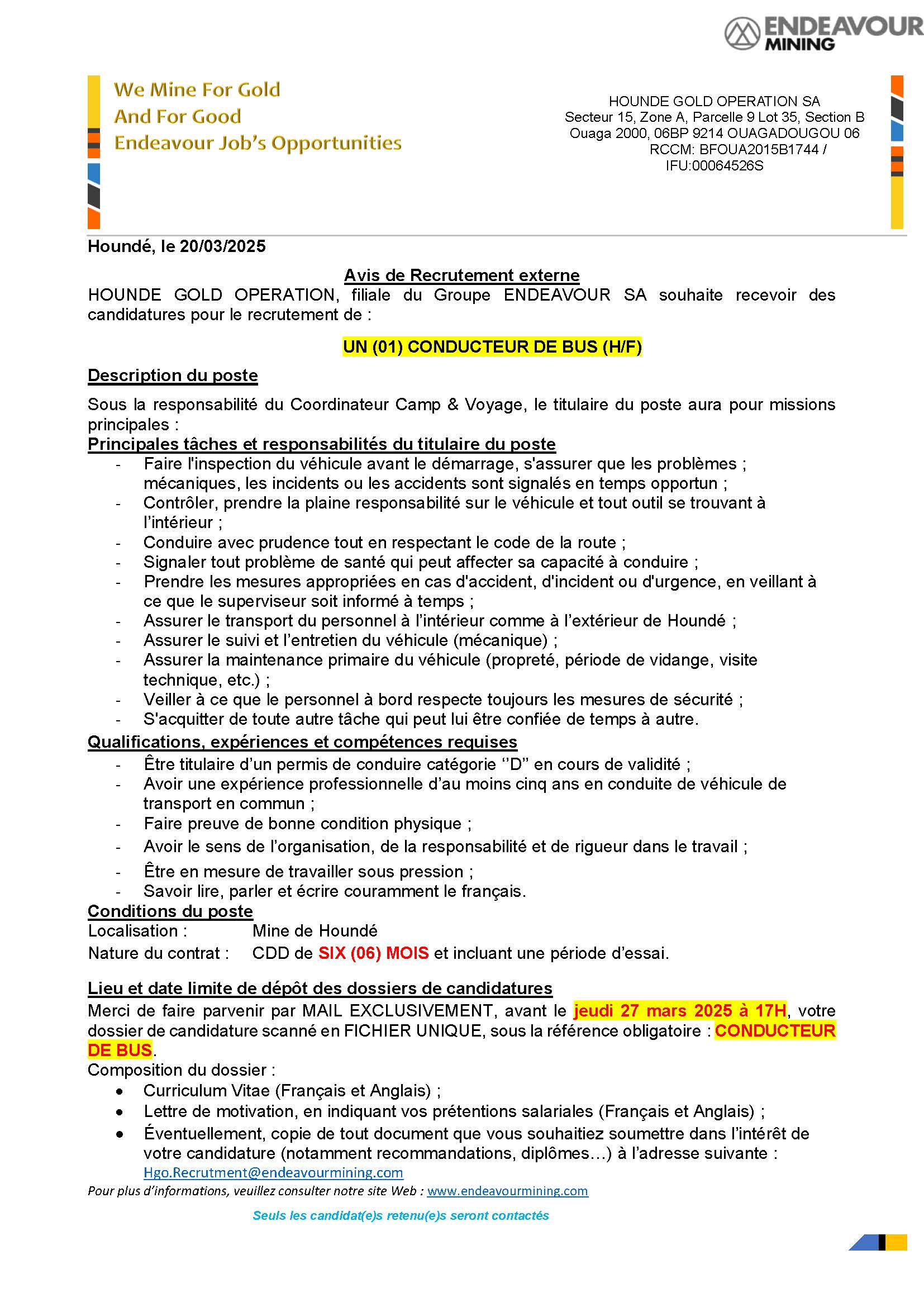 - HOUNDE GOLD OPERATION, filiale du Groupe ENDEAVOUR SA souhaite recevoir des candidatures pour le recrutement d’UN (01) INGENIEUR SENIOR DYNAMITAGE (H/F)