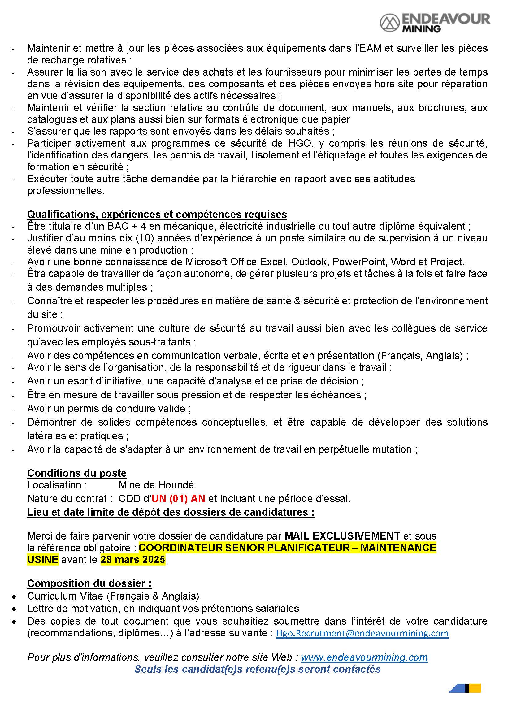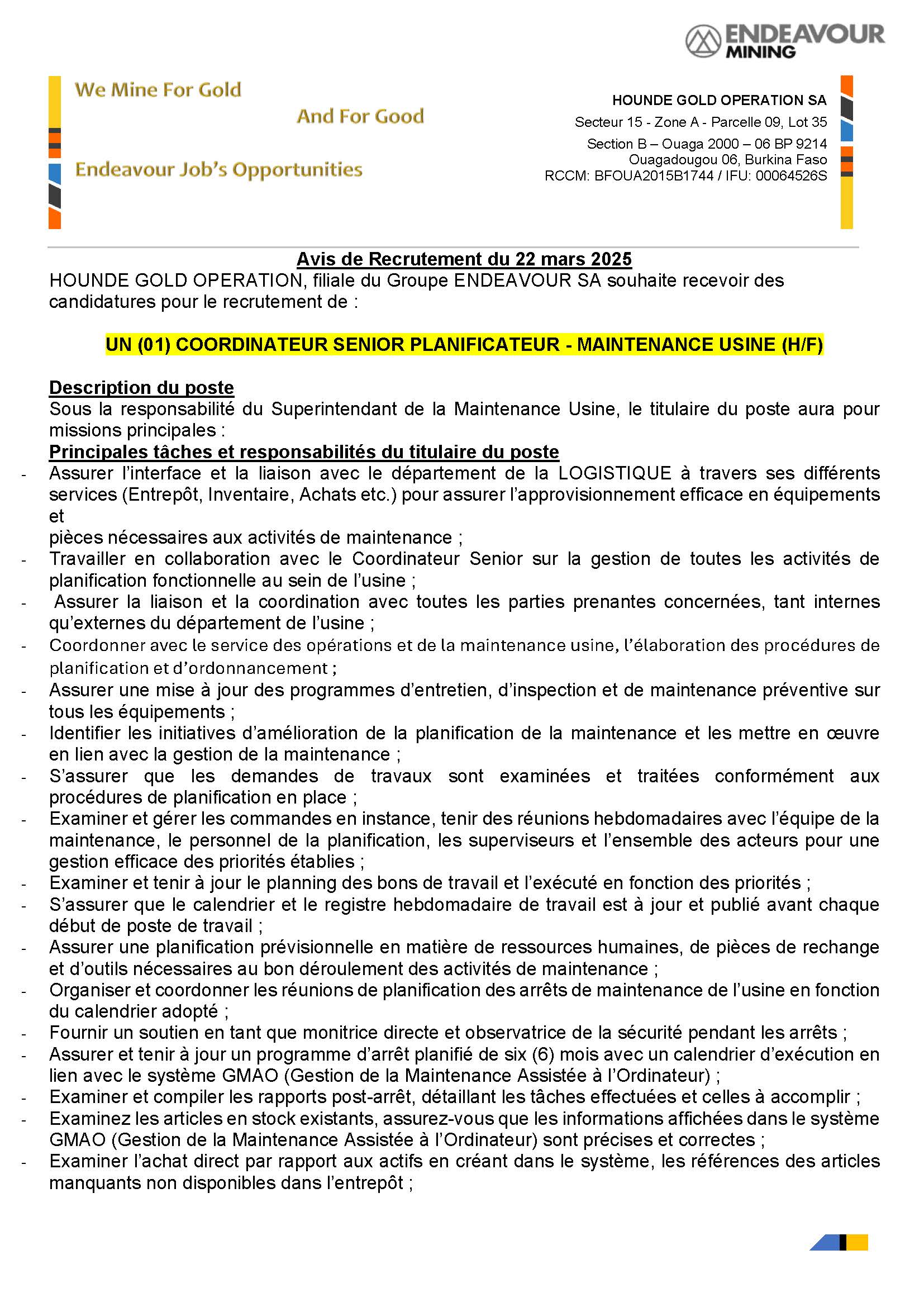 HOUNDE GOLD OPERATION, filiale du Groupe ENDEAVOUR SA souhaite recevoir des candidatures pour le recrutement de : UN (01) COORDINATEUR SENIOR PLANIFICATEUR – MAINTENANCE USINE (H/F)