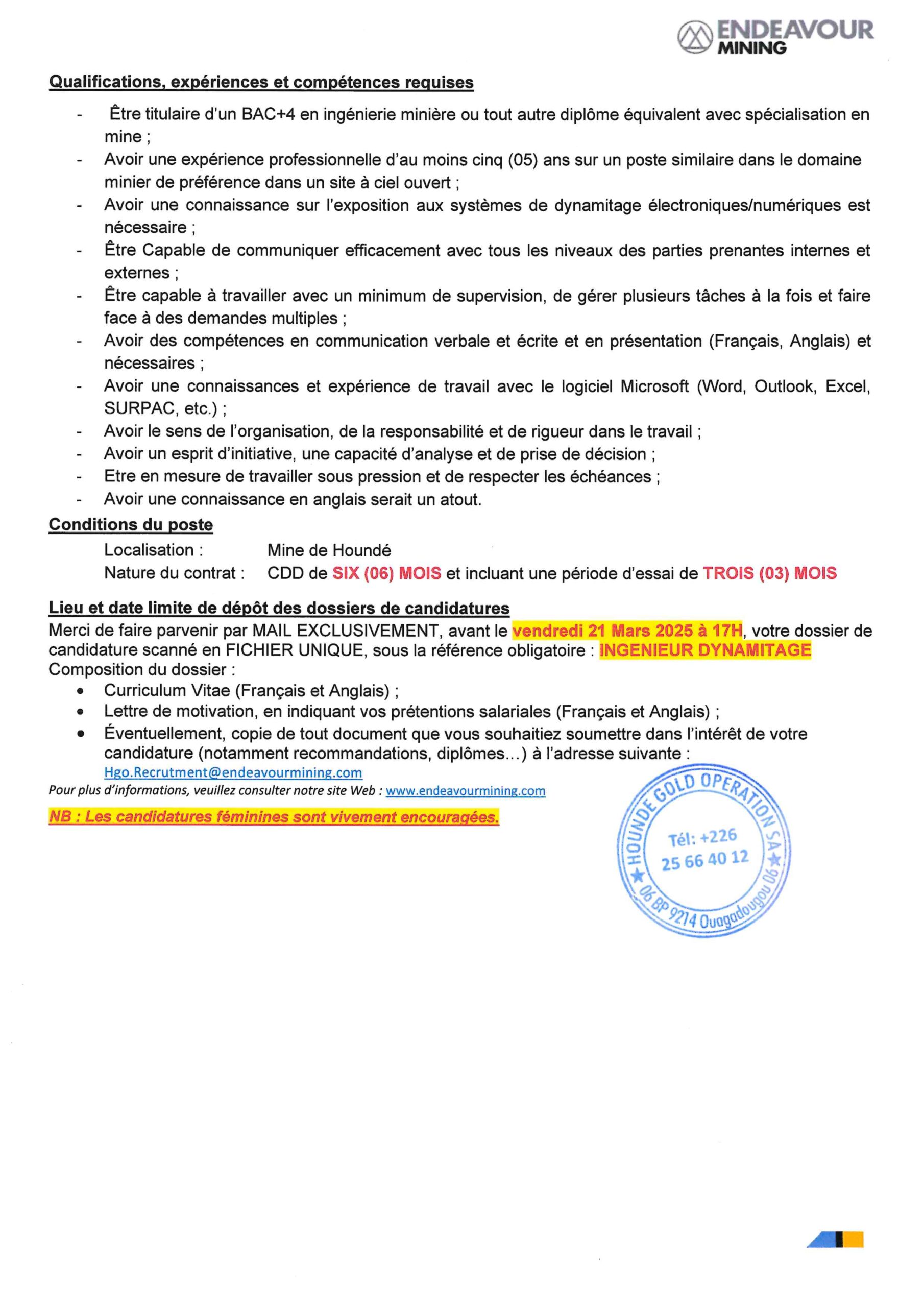 HOUNDE GOLD OPERATION, filiale du Groupe ENDEAVOUR SA souhaite recevoir des candidatures pour le recrutement de : UN (01) INGENIEUR DYNAMITAGE (H/F)