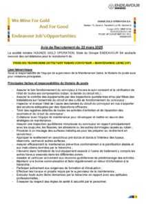- La société minière HOUNDE GOLD OPERATION, filiale du Groupe ENDEAVOUR SA souhaite recevoir des candidatures pour le recrutement externe de : 03 MECANICIENS ENGINS LEGERS