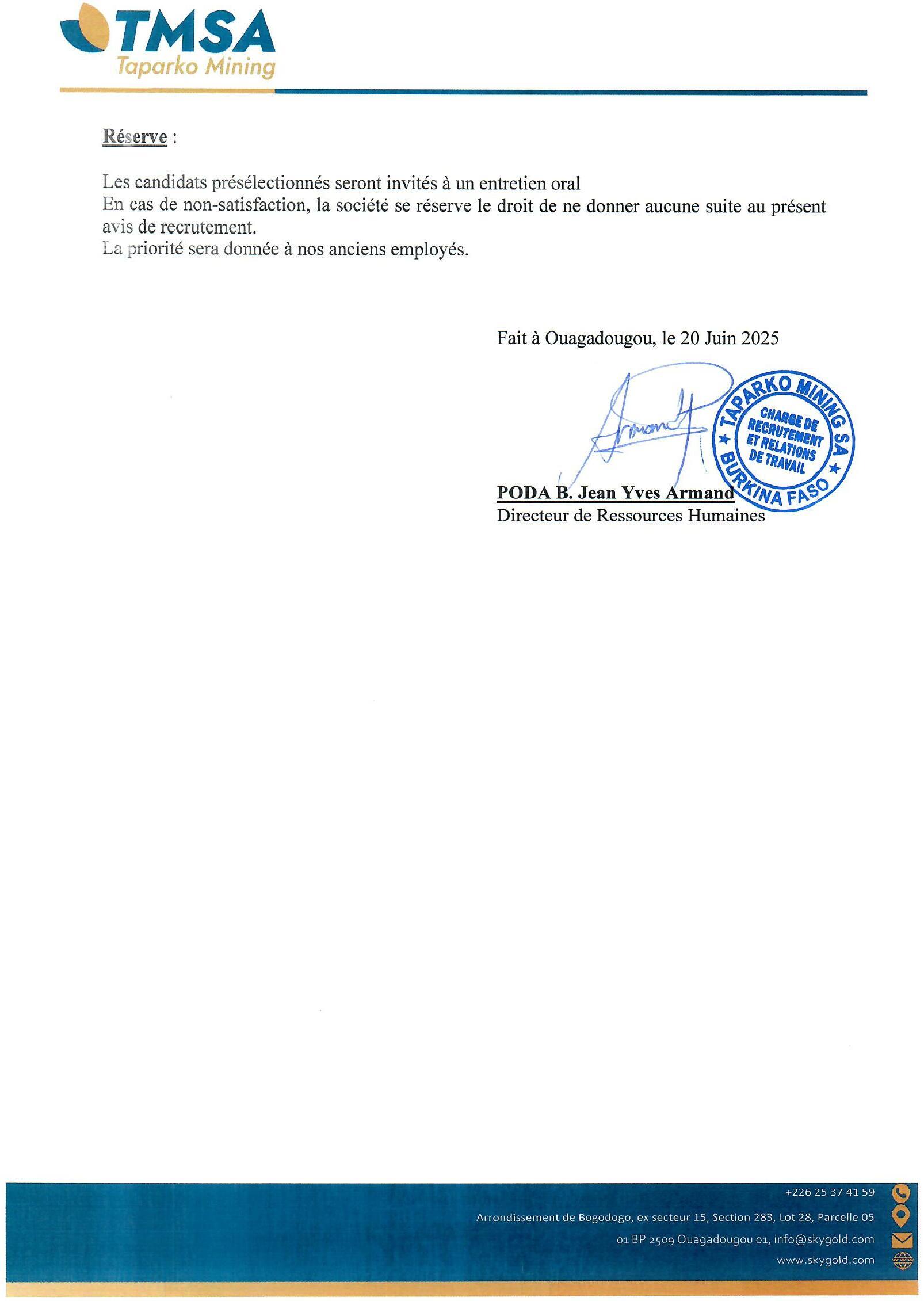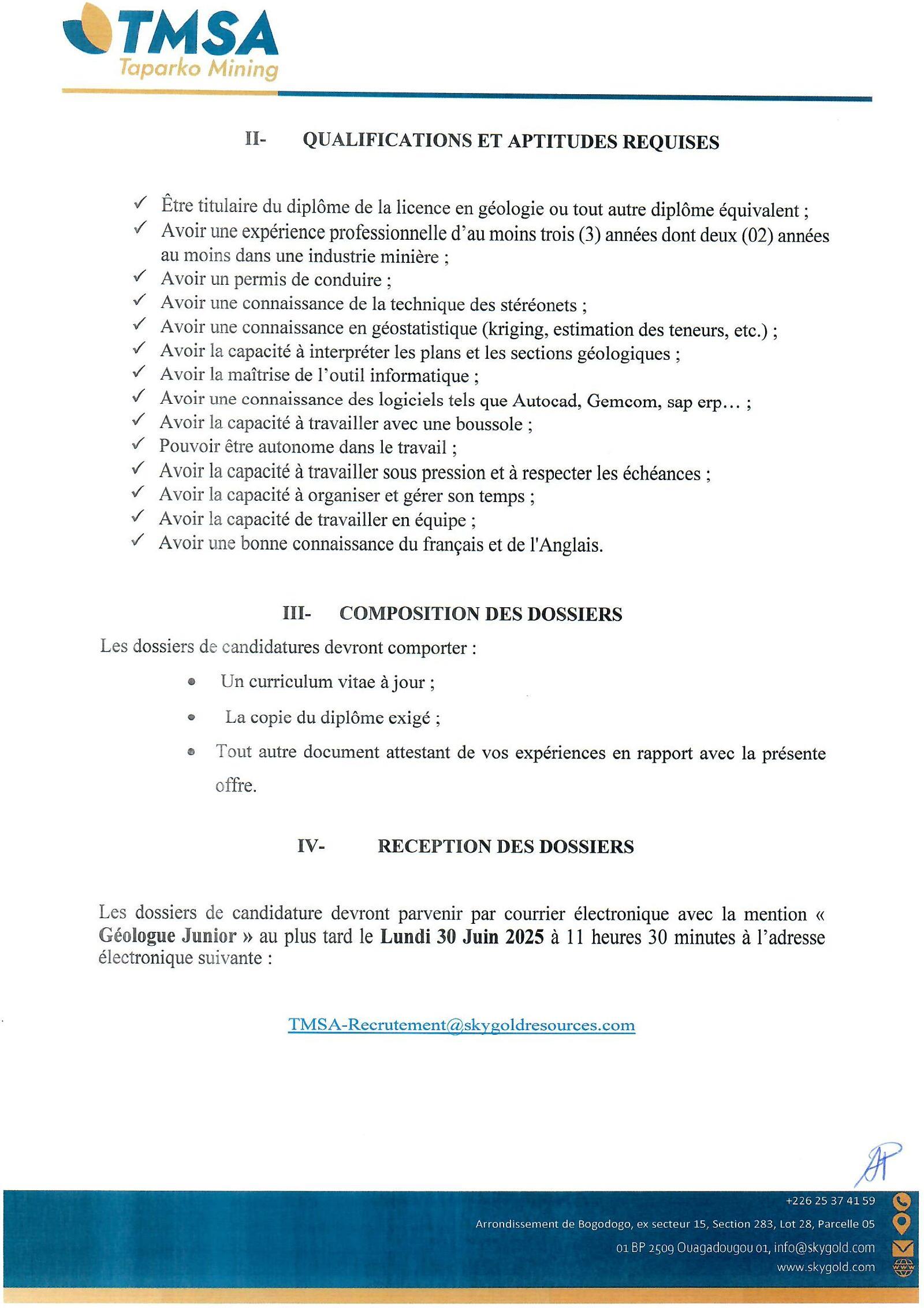 La société minière Taparko Mining (TM) SA, souhaite recevoir des candidatures pour le recrutement de : DEUX (02) « Géologue Junior » (H/F)