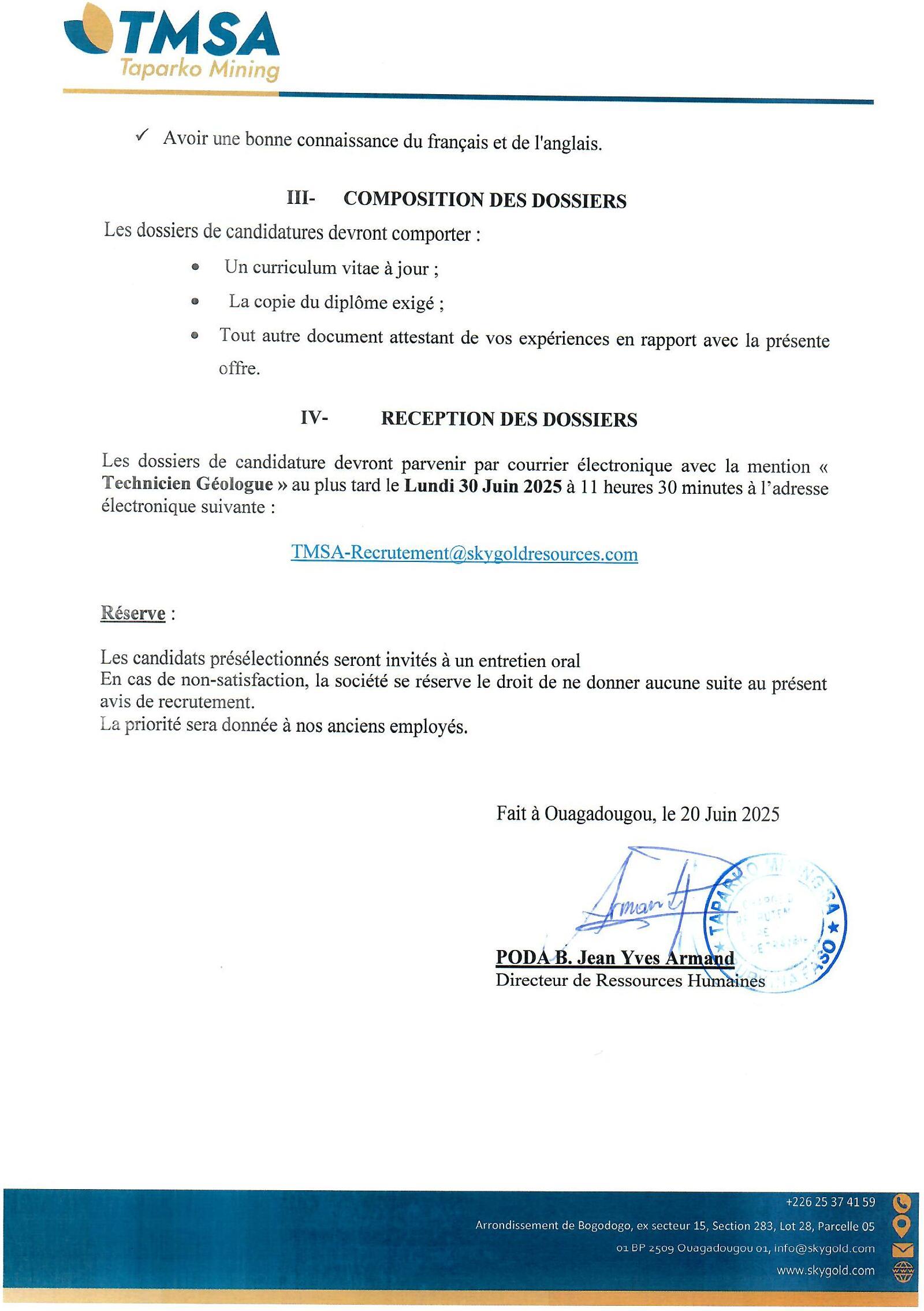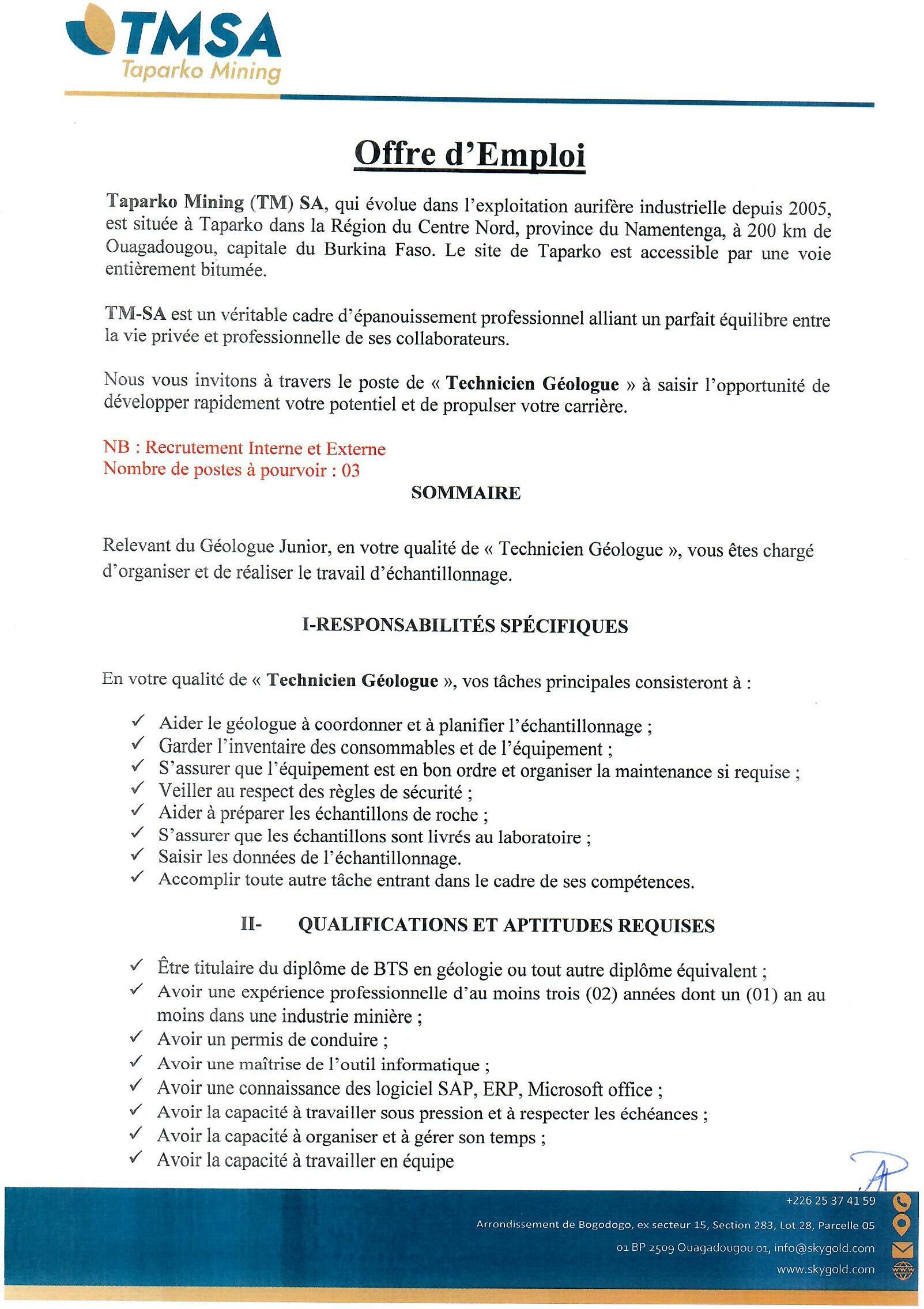 La société minière Taparko Mining (TM) SA, souhaite recevoir des candidatures pour le recrutement de : Trois (03) « Technicien Géologue » (H/F)